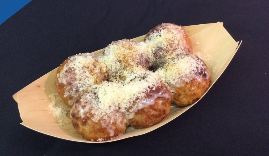 オリジナルブレンドの生地で焼き上げたものに、関西から取り寄せたソースとスペシャルミックスのマヨネーズをかけて。店長創作の塩チーズ味や、塩だれネギ味もあります。